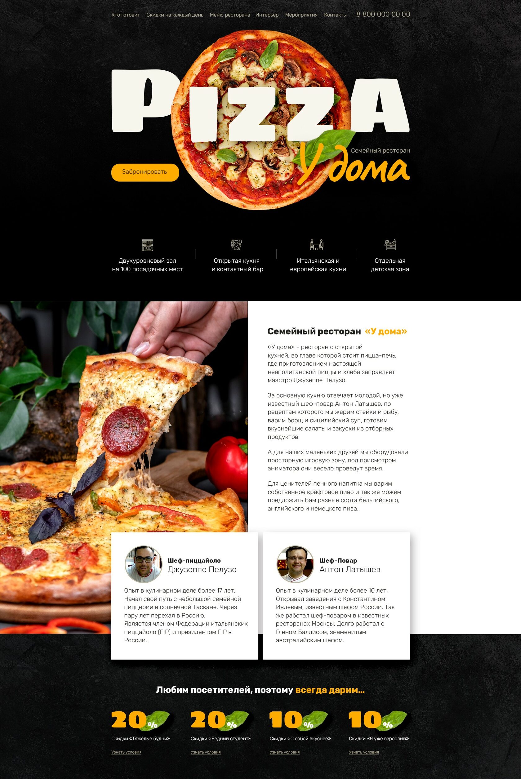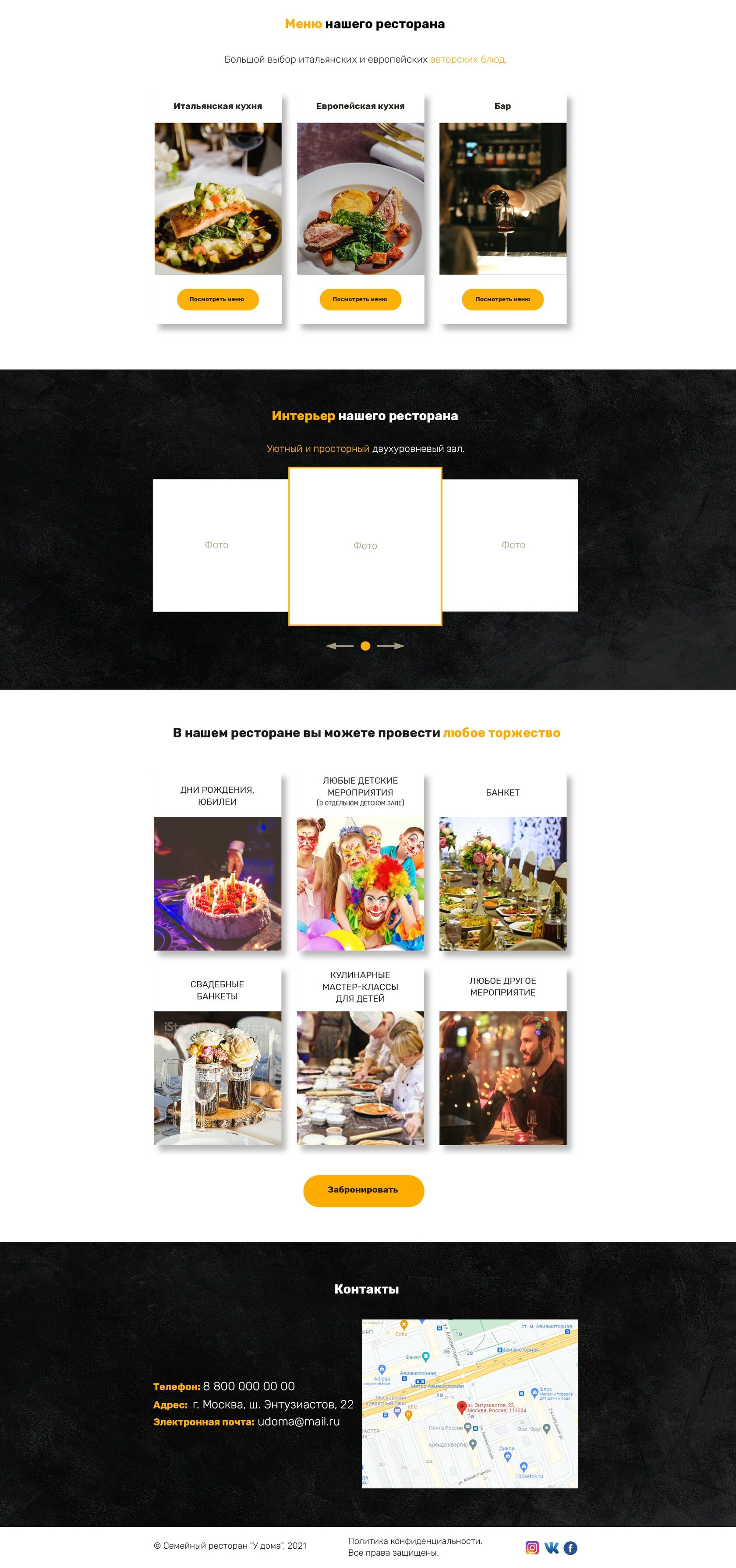 "У дома" — ресторан с открытой кухней, во главе которой стоит пицца-печь. Для маленьких гостей есть игровая зона под присмотром аниматора, где они могут провести весело время. А, для ценителей пенного напитка картофельное пиво собственного производства. Любимым посетителям всегда дарят скидки.