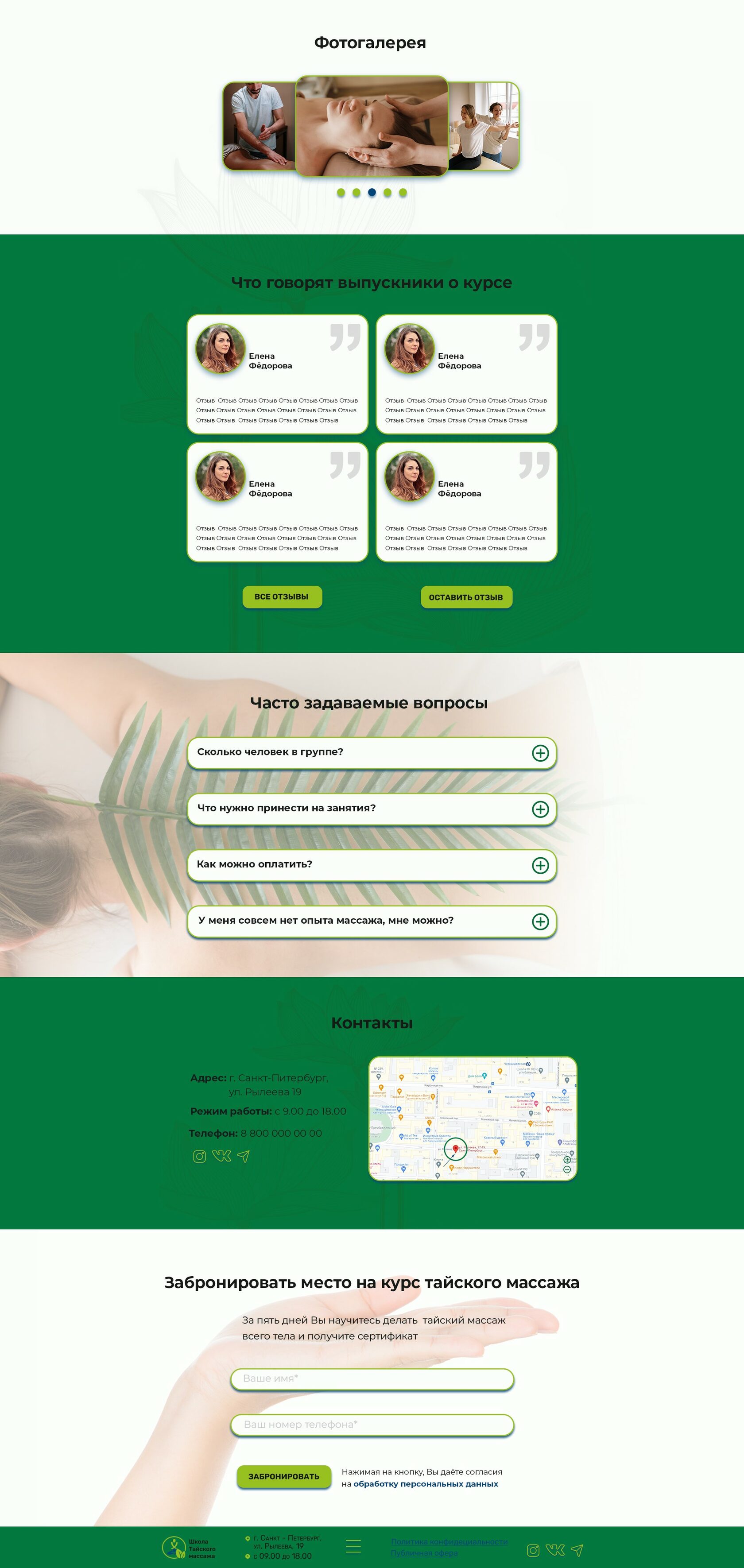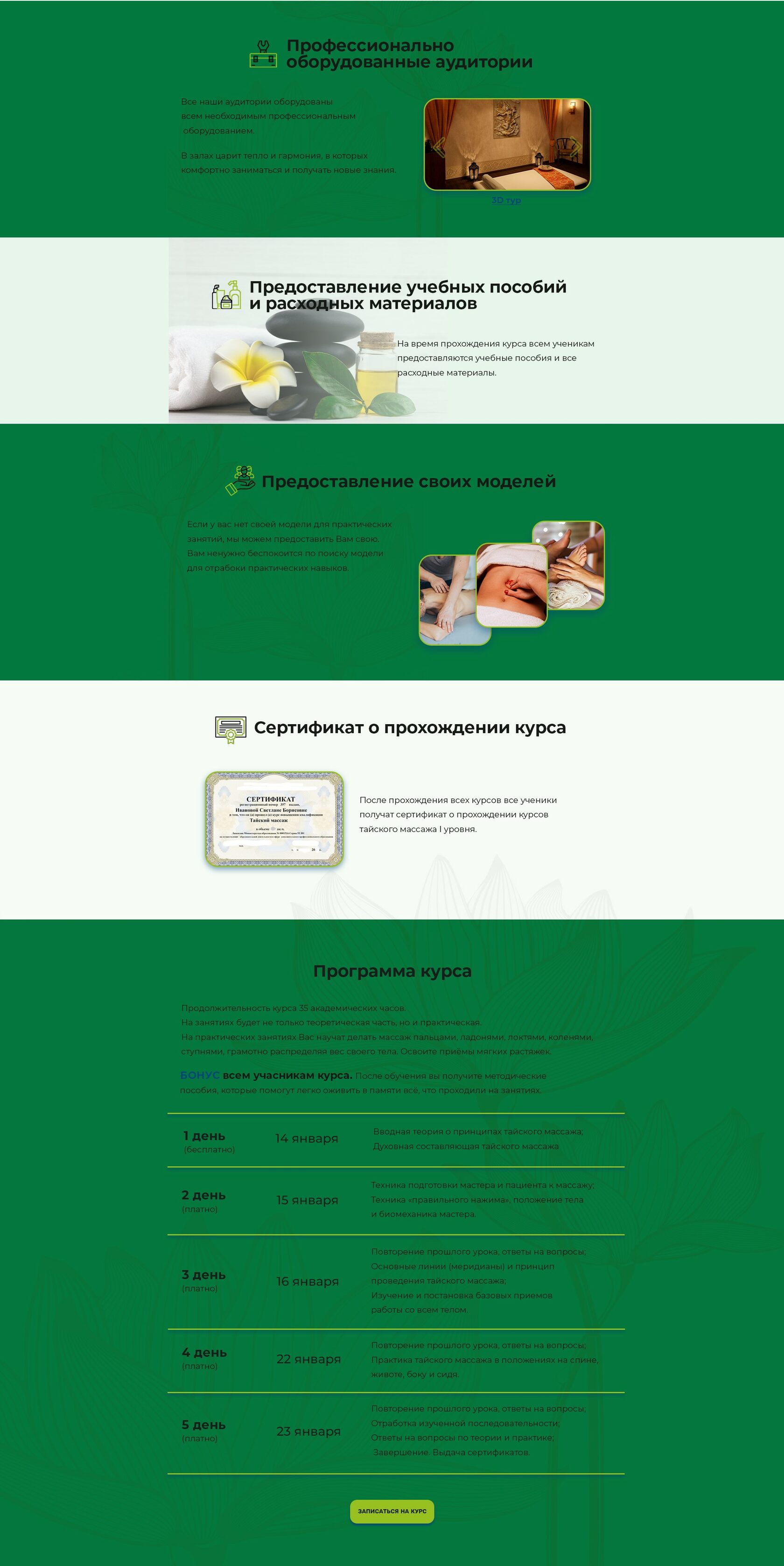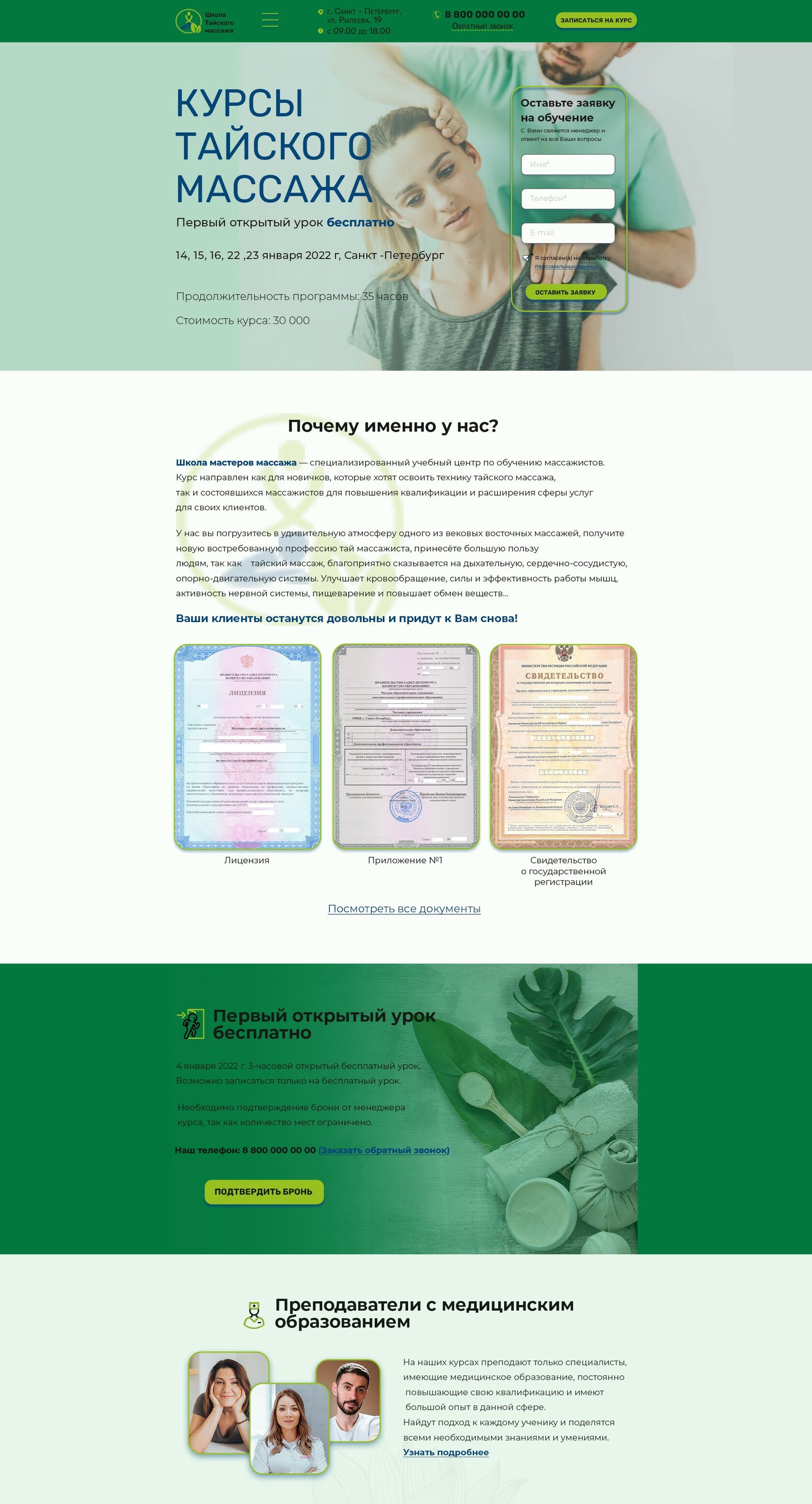 Разработать дизайн лендинга для школы по обучению массажистов, которая 5-дневный курс «Основы тайского массажа». Специальное предложение: первый открытый урок бесплатно.
